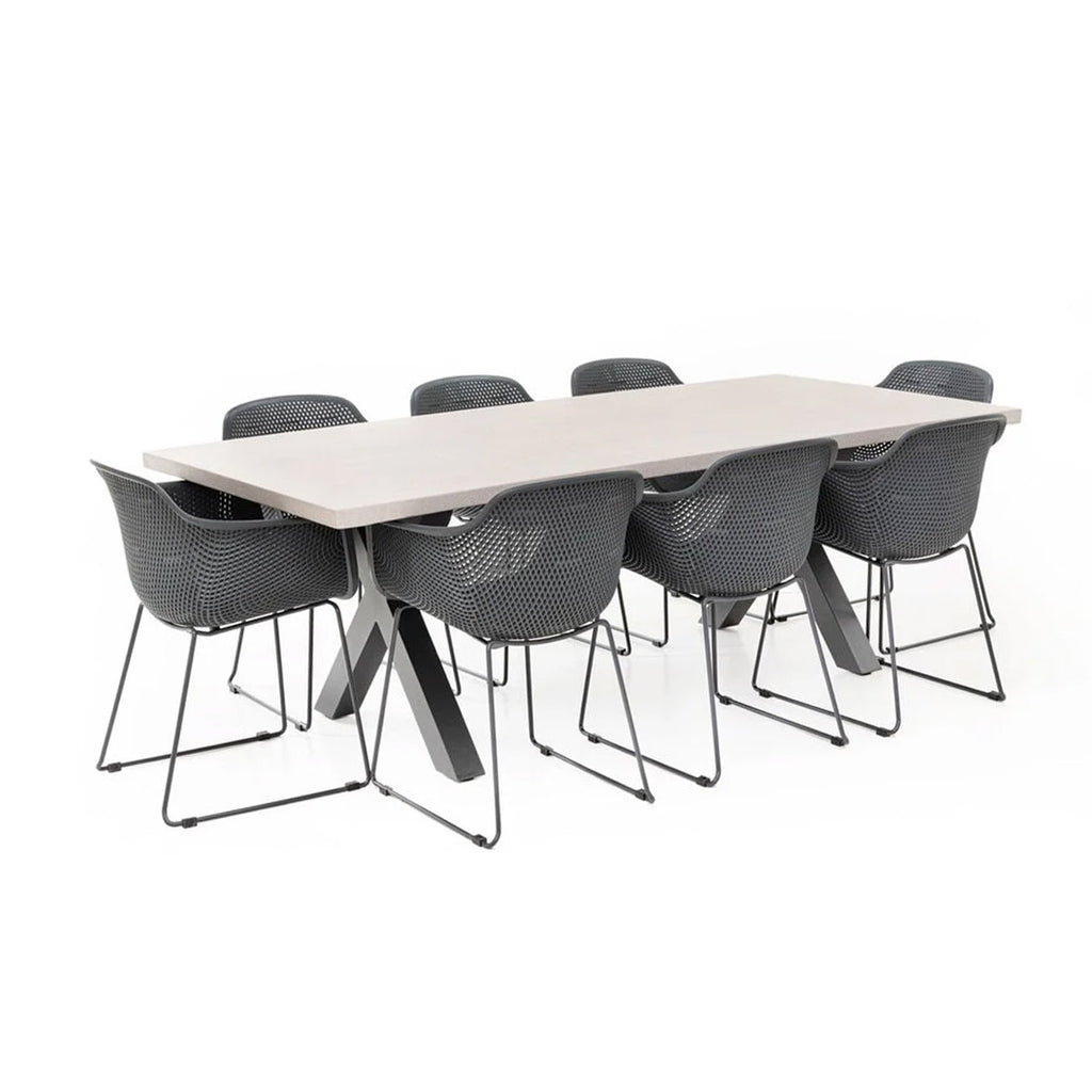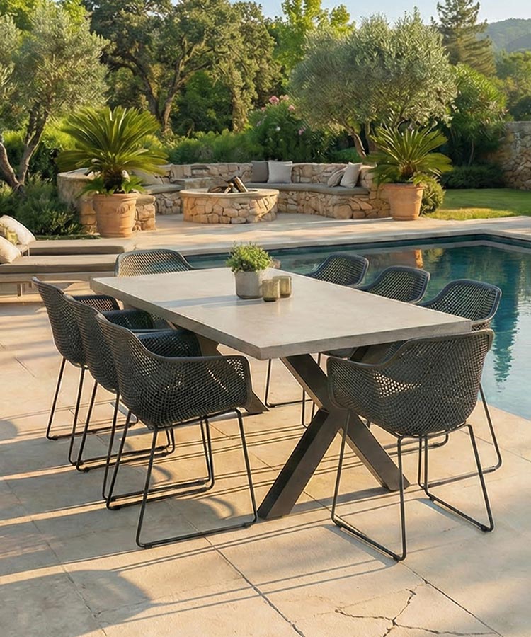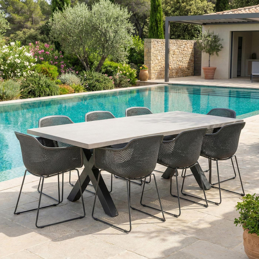 The Chelsea Dining table will look great in any outdoor setting; this eye-catching piece will be the envy of family and friends. The table is made from glass reinforced concrete while the legs are a powder coated aluminium available in two colours.