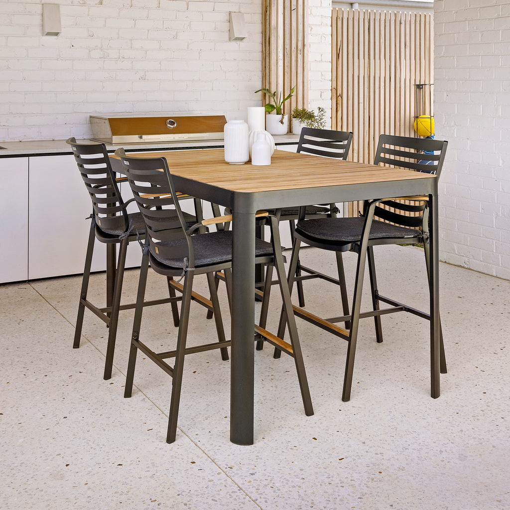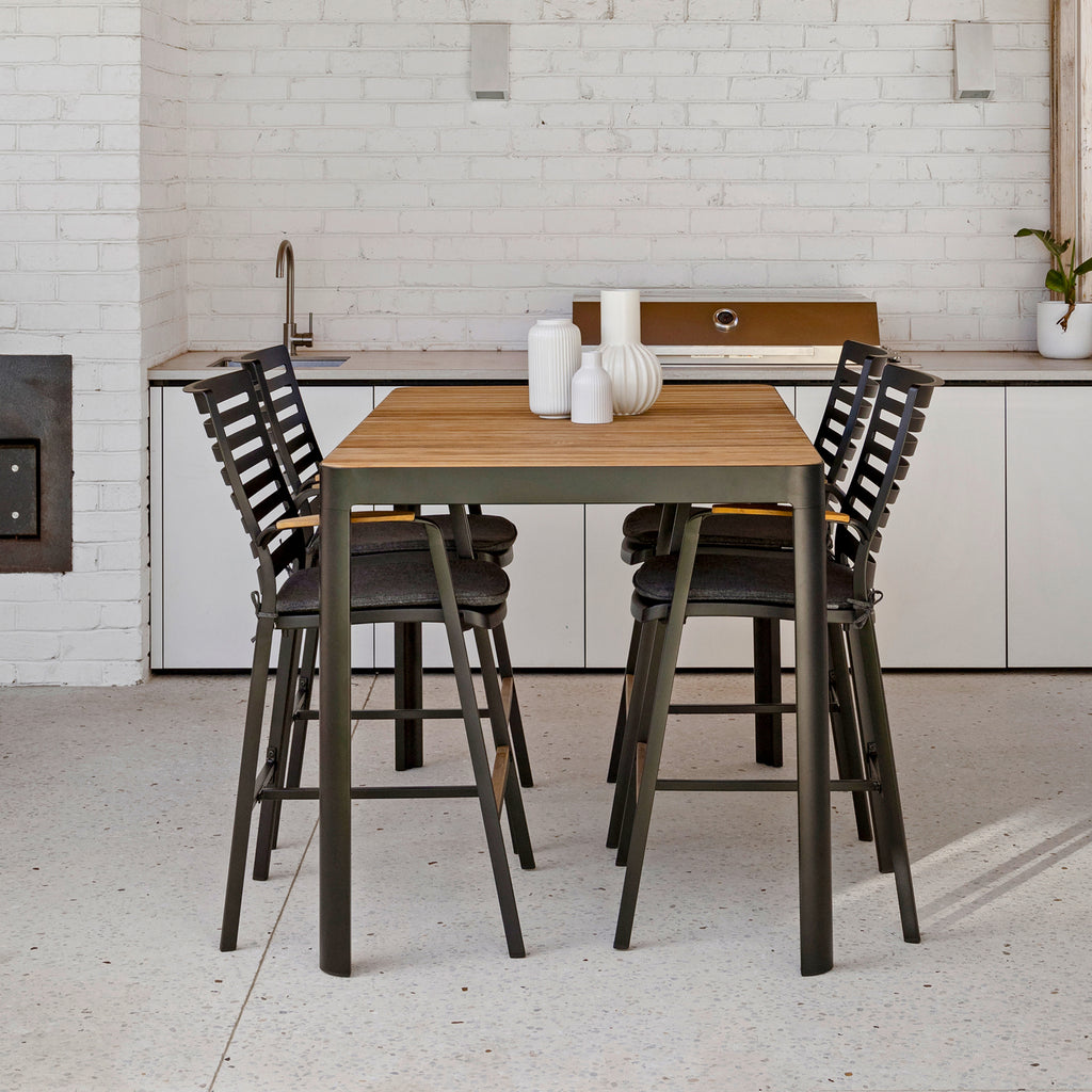 The Monico Bar Setting pairs modern sophistication with the natural charm of teak. Its solid teak-slat tabletop is framed in black for a refined, contemporary contrast. Complete with spacious bar-height chairs, this setting seats four or more—ideal for laid-back drinks, casual meals, or intimate open-air entertaining.