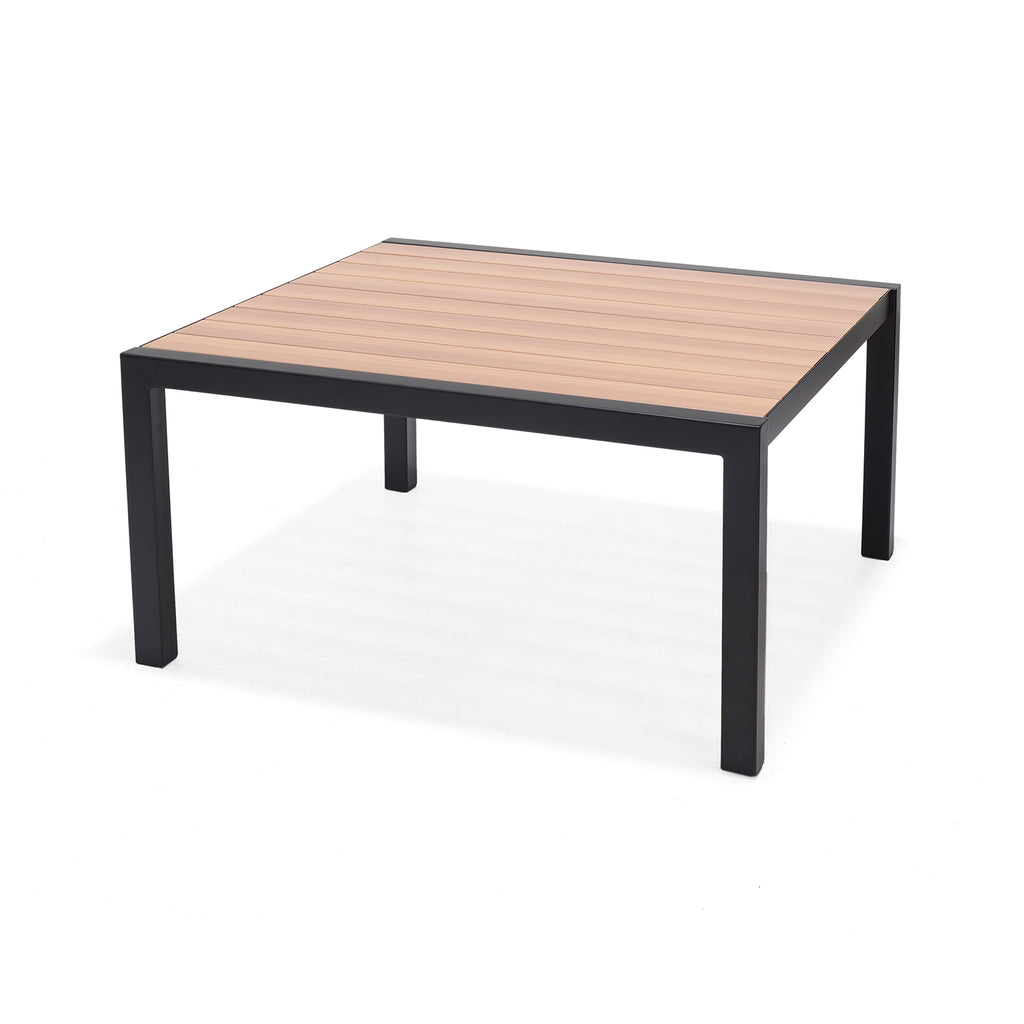 Featuring plush cushions crafted from premium Olefin fabric, this set offers lasting comfort and durability. The sleek black aluminium frame ensures strength and stability, while the wood-look armrest accents beautifully coordinate with the matching coffee table - blending modern design with natural appeal.