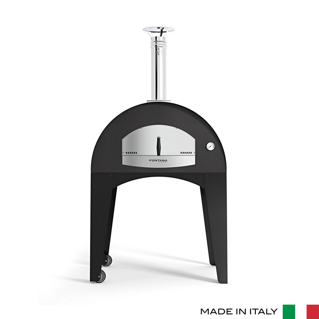 The Capri Wood Fire Pizza Oven created in Italy is constructed with a painted steel trolley with wheels which is provided with wood-holder plate, flue pipe with adjustable smoke exit valve and chimney top, closing door for the cooking chamber. The fire surface is made of high quality refractory chamotte, perfect for food use. The internal structure is in stainless steel, while the external one is in electrogalvanized steel treated with paints at high temperature for the maximum resistance to heat, weather and rust. The insulation of the oven is made of natural rock wool and it allows to maintain temperature more efficiently and to avoid that the external structure becomes to hot.