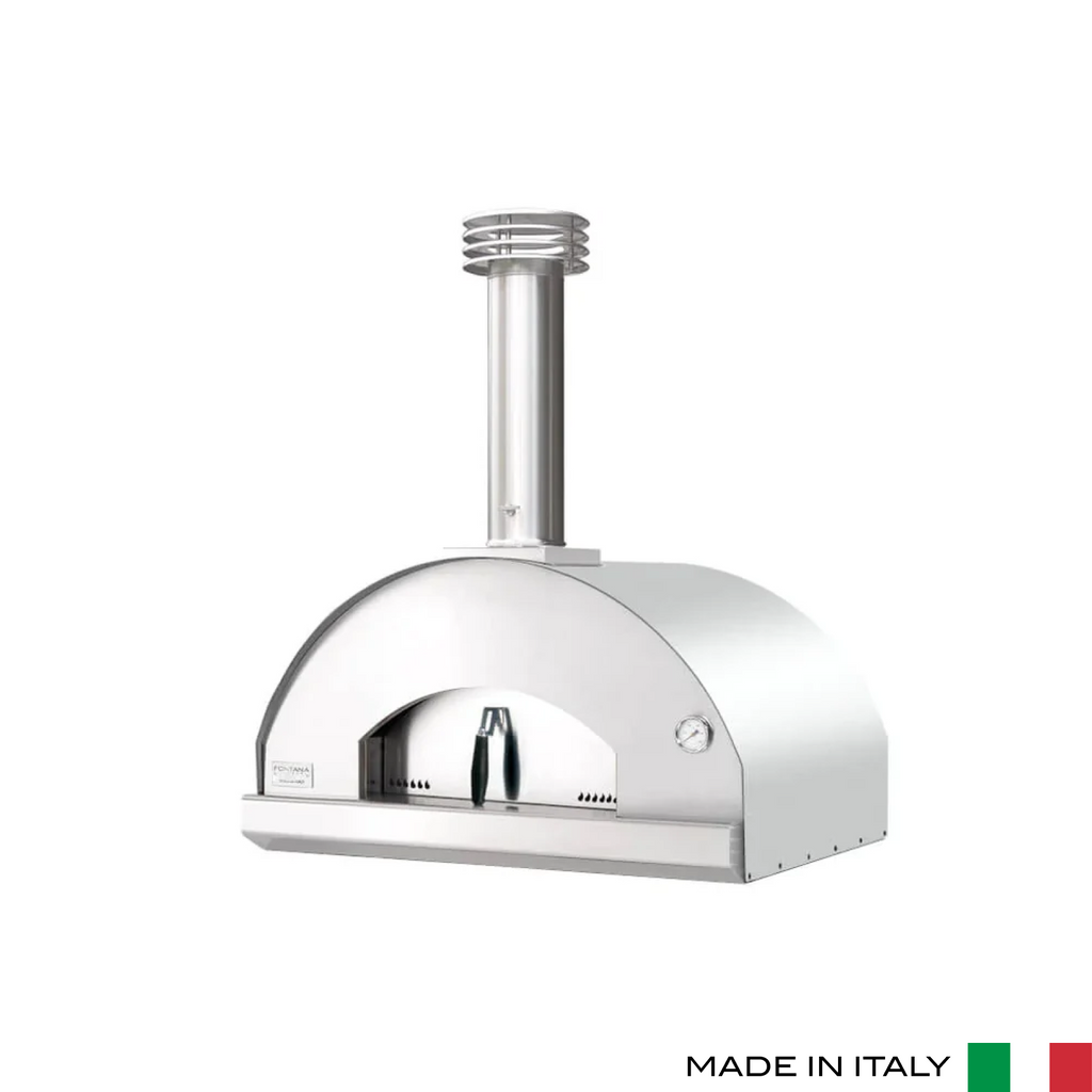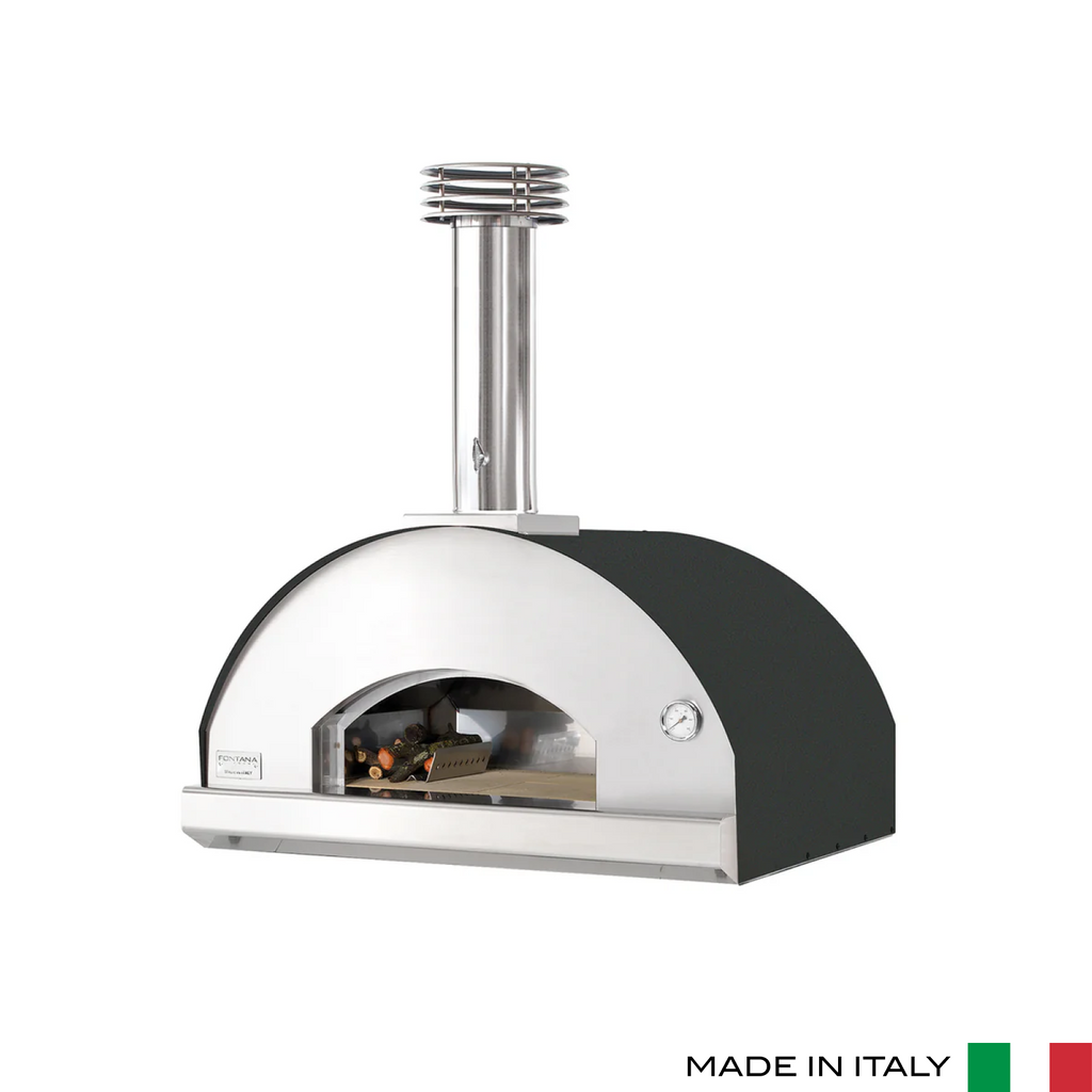 The Fontana MANGIAFUOCO Oven features 80 x 60 cm cooking chamber. It comes complete with a wood- holder plate, fire tool, flue pipe and chimney top and removable stainless steel door for the cooking chamber. The fire surface is made of high quality refractory chamotte which is certified for food use. The internal structure is made of stainless steel, while the external one is electro-galvanised steel treated with paints at high temperature for maximum resistance to heat, weather and rust. The insulation of the oven is made of natural rock wool that maintains temperature more efficiently and avoids the external structure becoming too hot.
