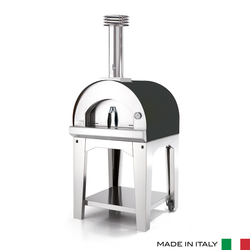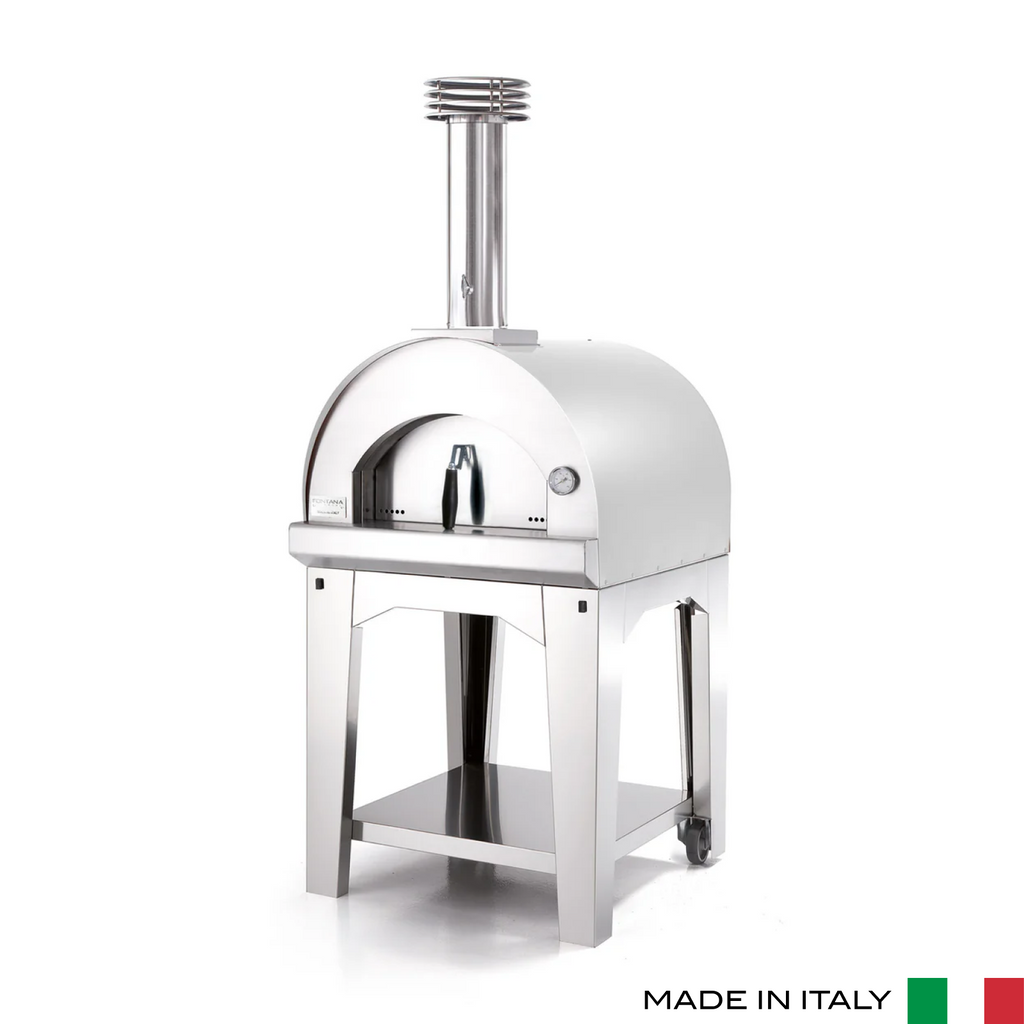 The Fontana MARGHERITA Oven features 60 x 60 cm cooking chamber. It comes complete with a wood- holder plate, fire tool, flue pipe and chimney top and removable stainless steel door for the cooking chamber. The fire surface is made of high quality refractory chamotte which is certified for food use. The internal structure is made of stainless steel, while the external one is electro galvanised steel treated with paints at high temperature for maximum resistance to heat, weather and rust. The insulation of the oven is made of natural rock stainless steel chimney wool that maintains temperature more efficiently and avoids the external structure becoming too hot.