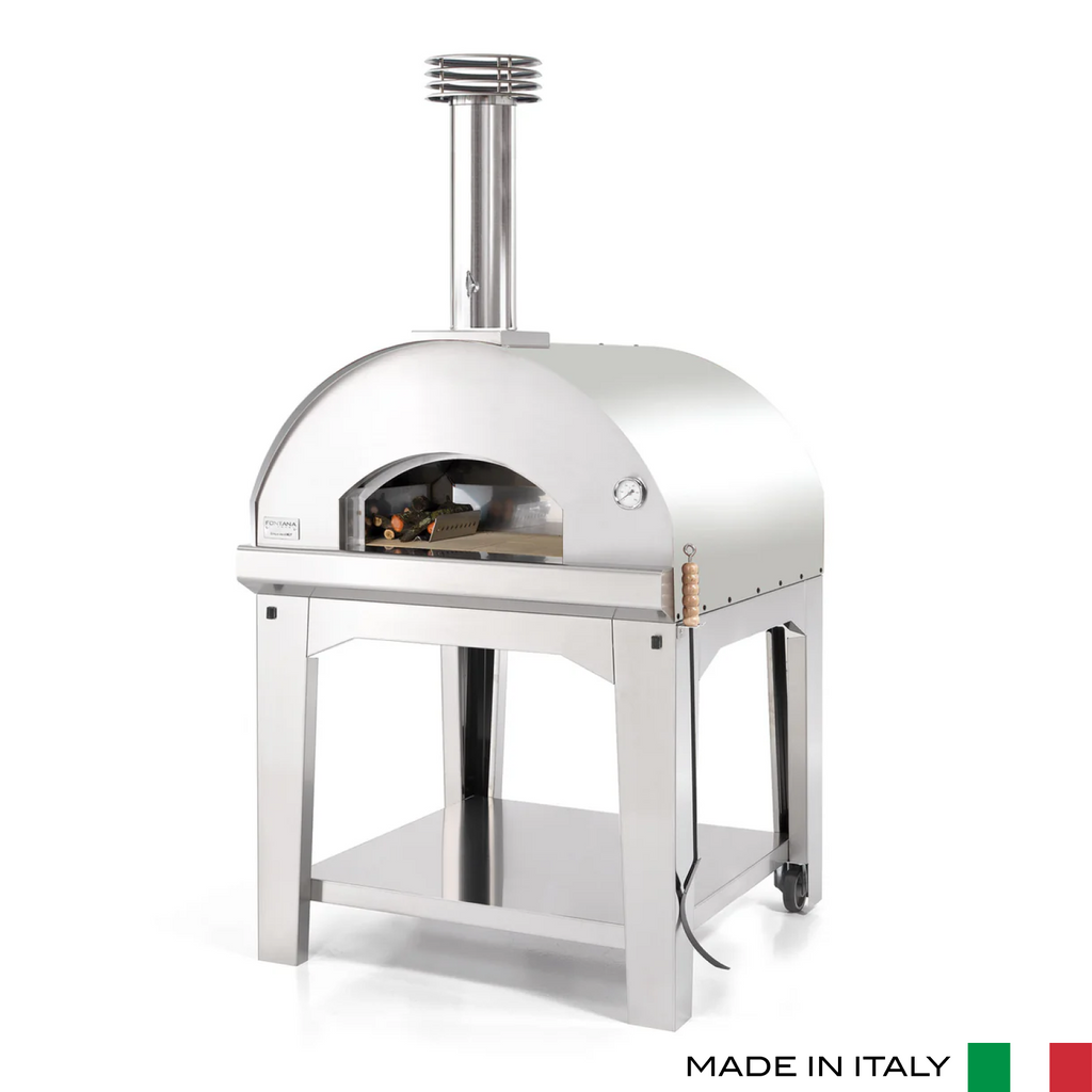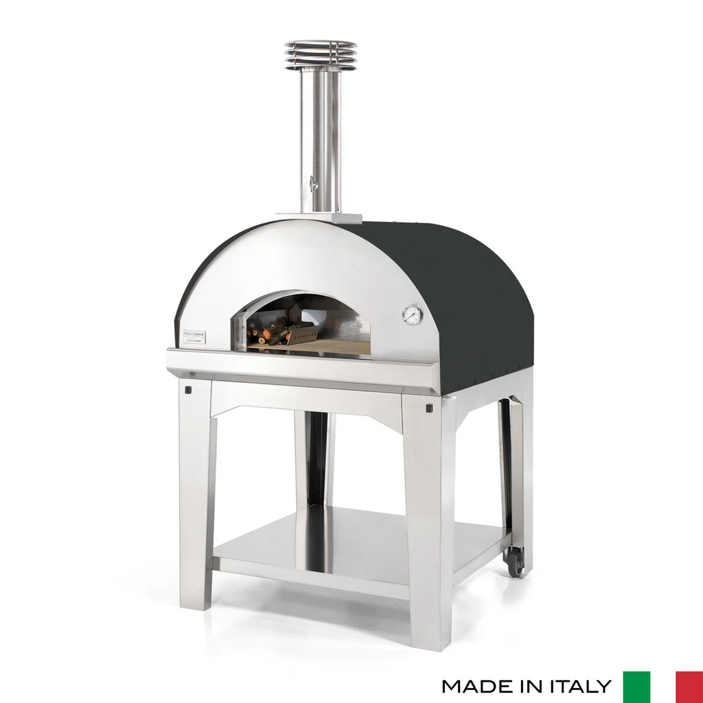 The Fontana Marinara Wood Fire Pizza Oven has a generously sized 80 x 80 cm cooking chamber. Equipped with a practical stainless steel trolley with shelf, wheels and hook to hang tools, it is provided with wood-holder plate, fire tool, flue pipe and chimney top, closing door for the cooking chamber. The fire surface is made of high quality refractory chamotte, certified for food use. The internal structure is in stainless steel, while the external one is in electrogalvanized steel treated with paints at high temperature for the maximum resistance to heat, weather and rust.