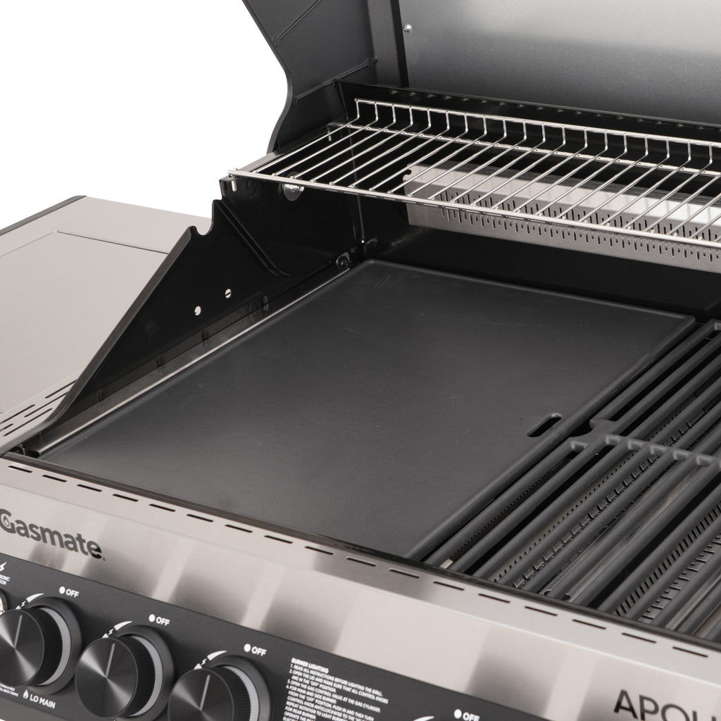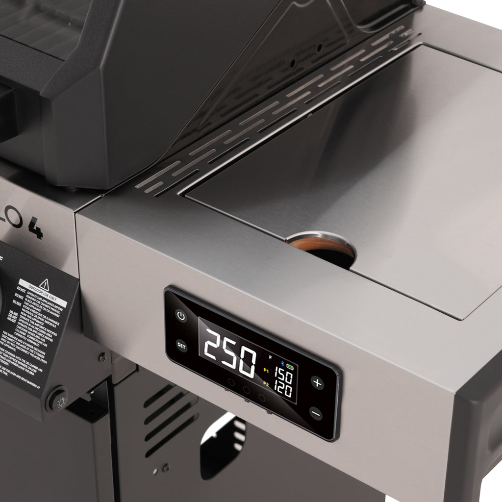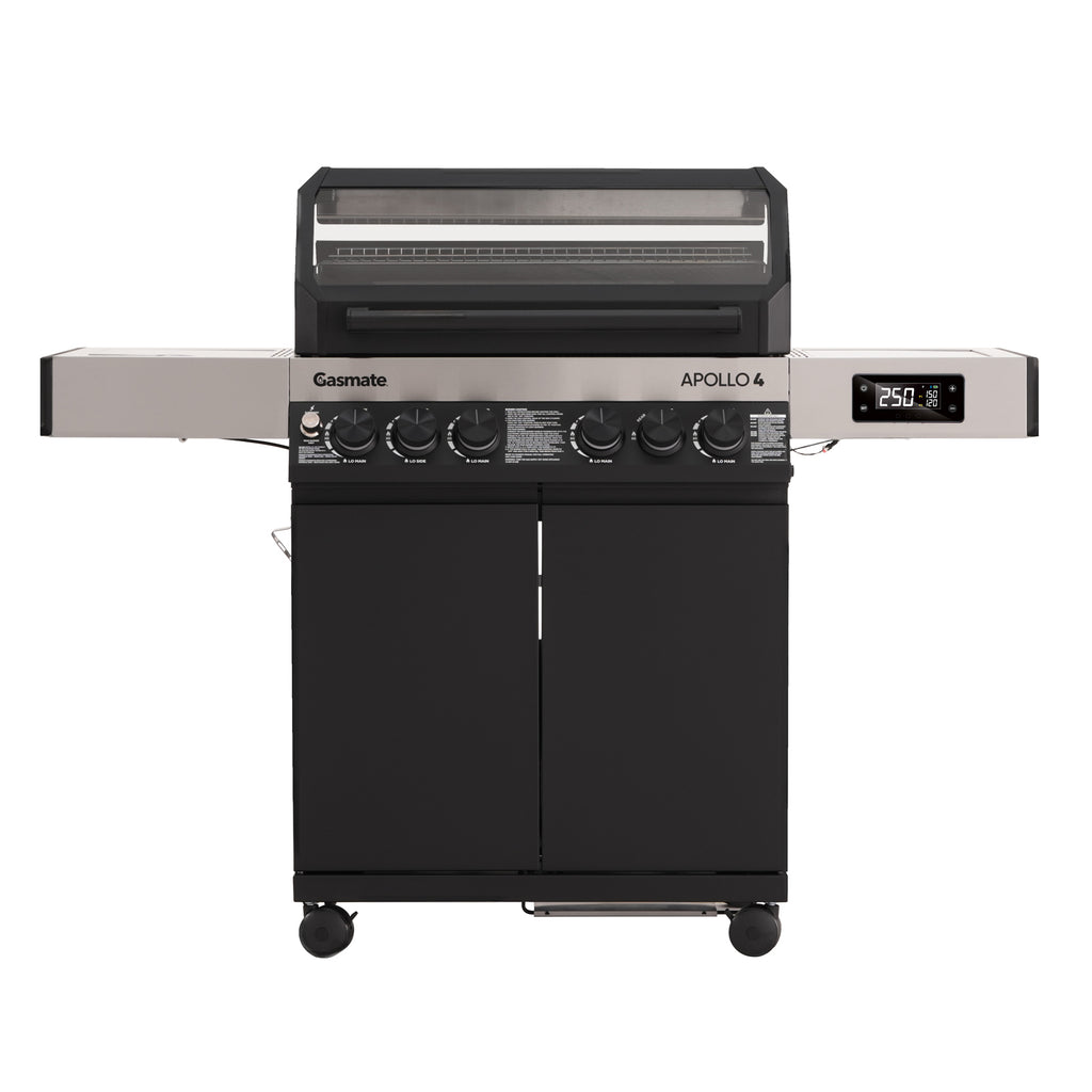 The Gasmate Apollo 4 Burner BBQ combines smart design with impressive cooking performance. Its durable powder-coated body and hood feature a large glass viewing window, delivering both style and practicality. Stainless steel fascia and side shelves pair with a battery-powered digital control panel, plus two plug-in temperature probes that connect to a Bluetooth/WiFi smartphone app for effortless monitoring.