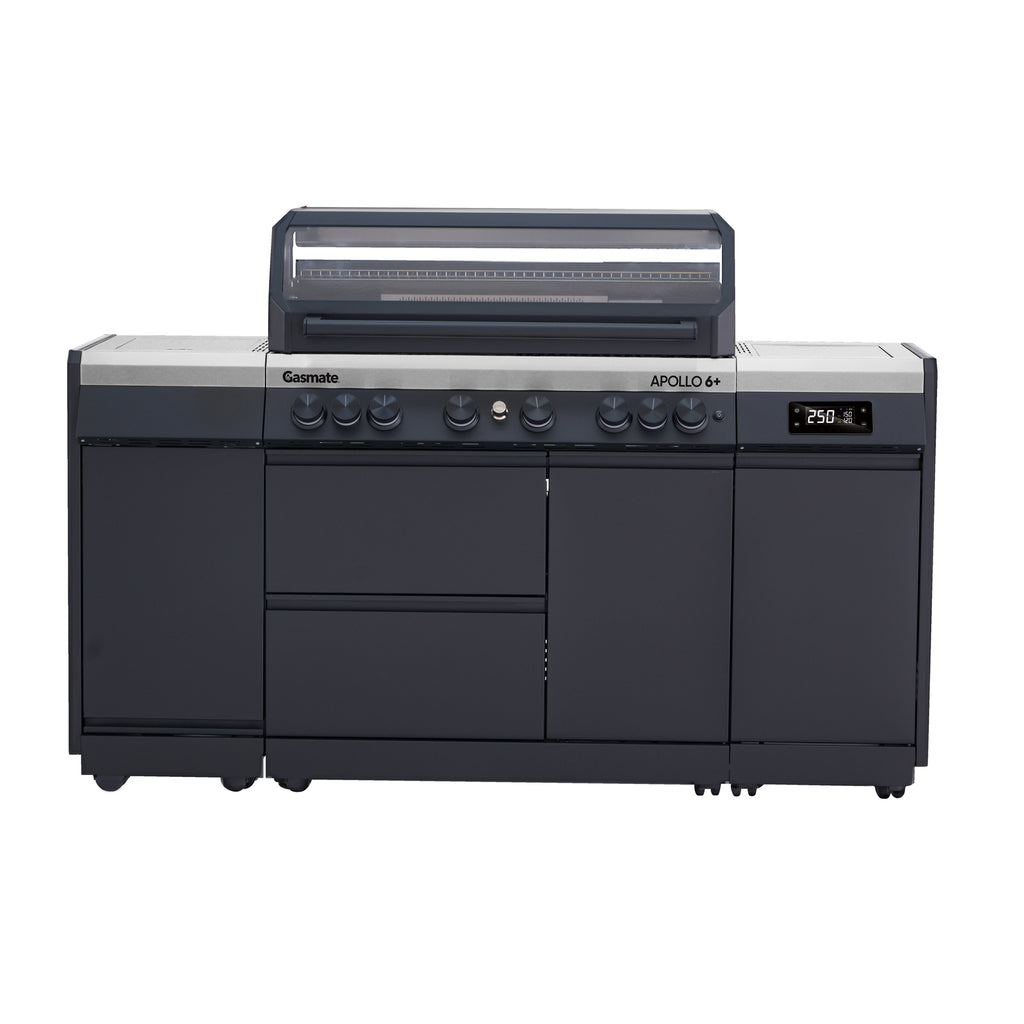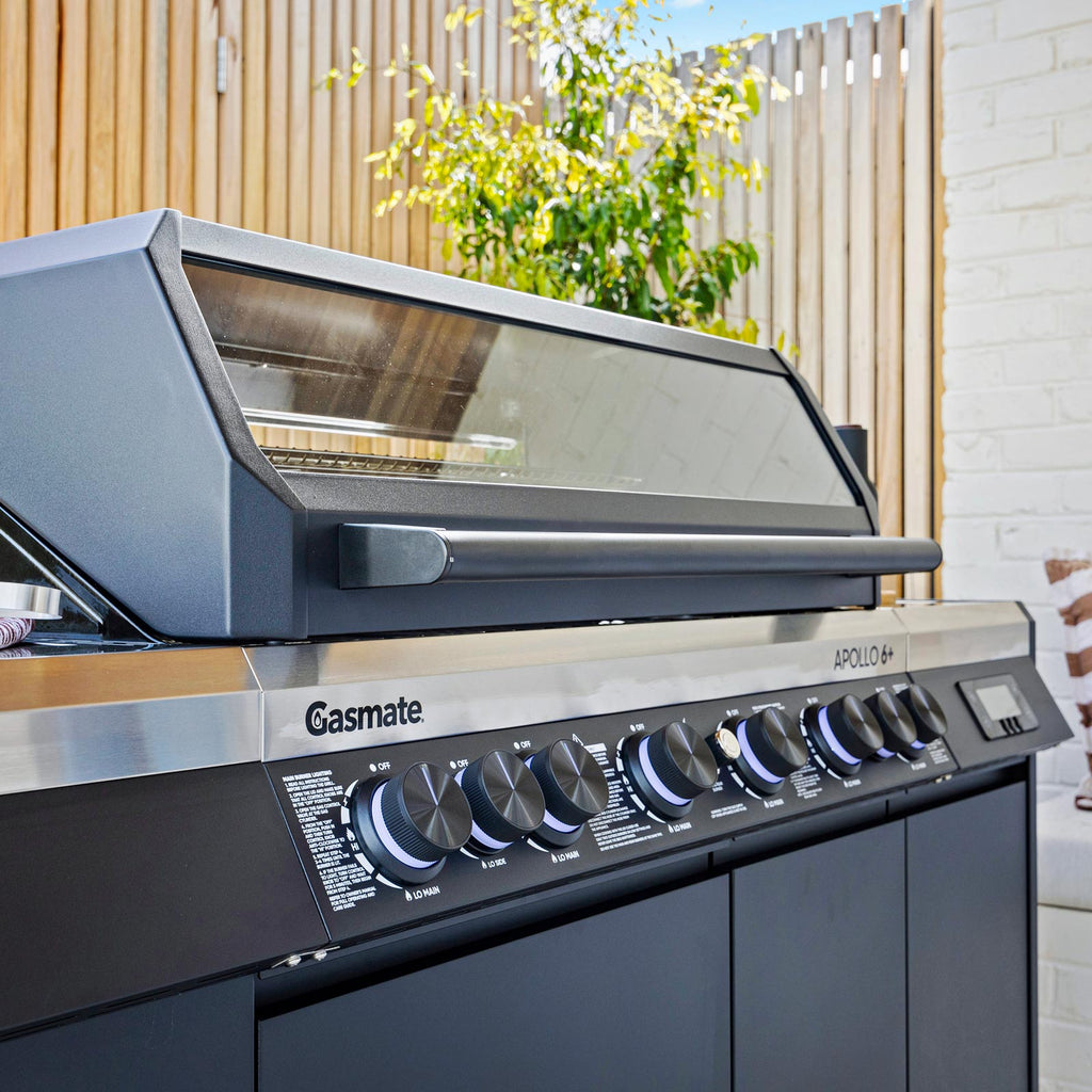 Built for serious outdoor entertaining, the Gasmate Apollo 6+ 6-Burner BBQ combines modern design with rugged performance. Its sleek black powder-coated body and hood are complemented by matching hood ends and a large glass viewing window, while stainless steel fascia and durable side shelves elevate both form and function.