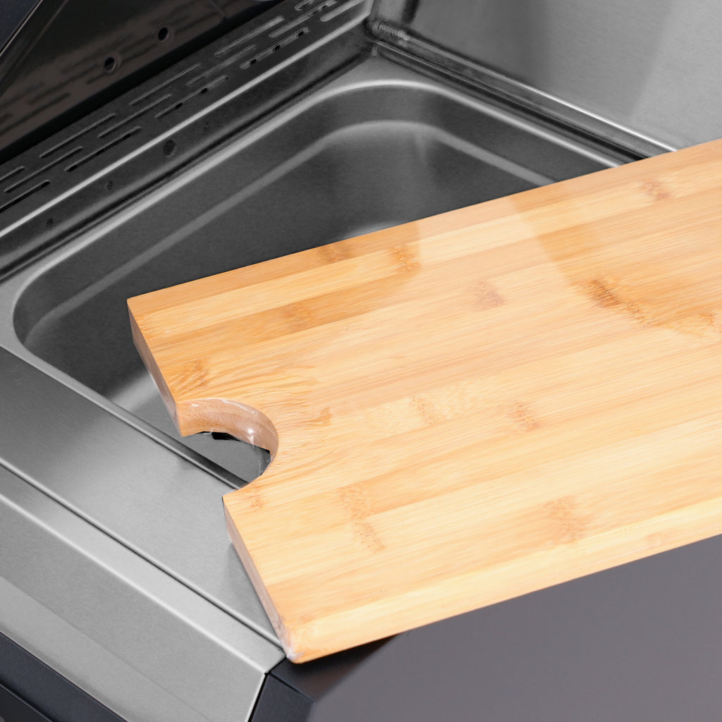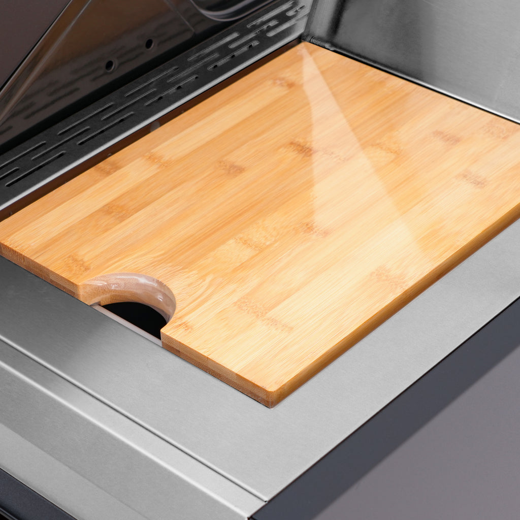 Smart storage and workspace features include a left-side burner cabinet with a lift-up door that converts into a convenient shelf, plus a right-side shelf with an integrated ice or storage tub topped by a bamboo cutting board.