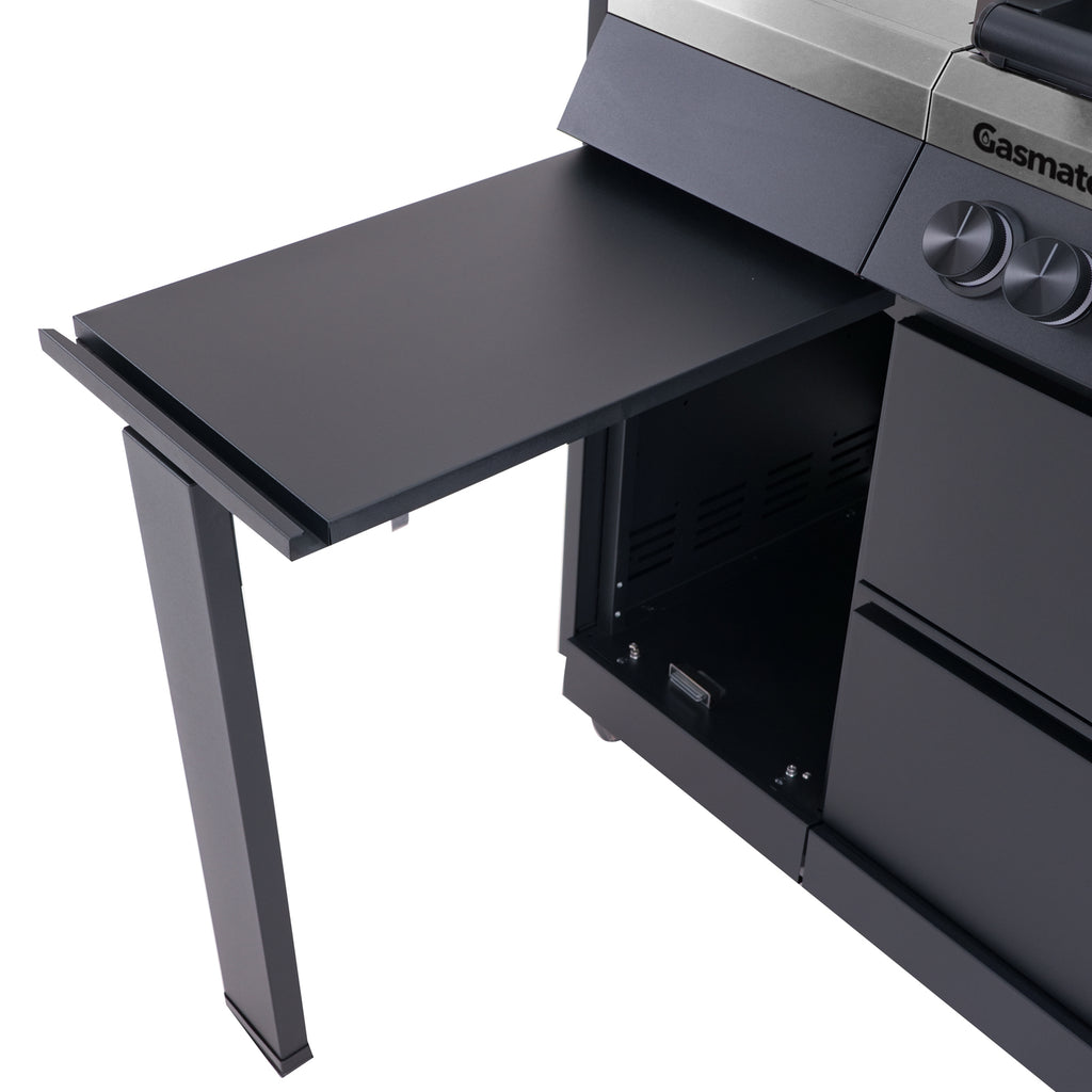 Left-side burner cabinet with a lift-up door that converts into a convenient shelf