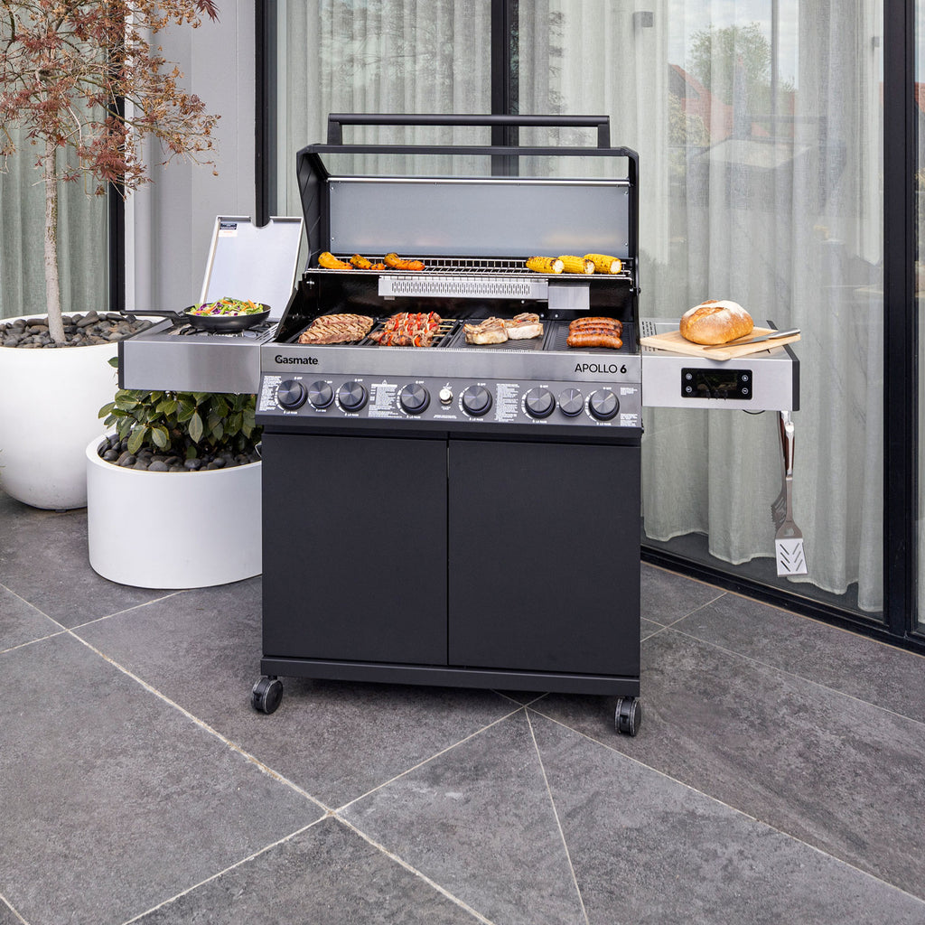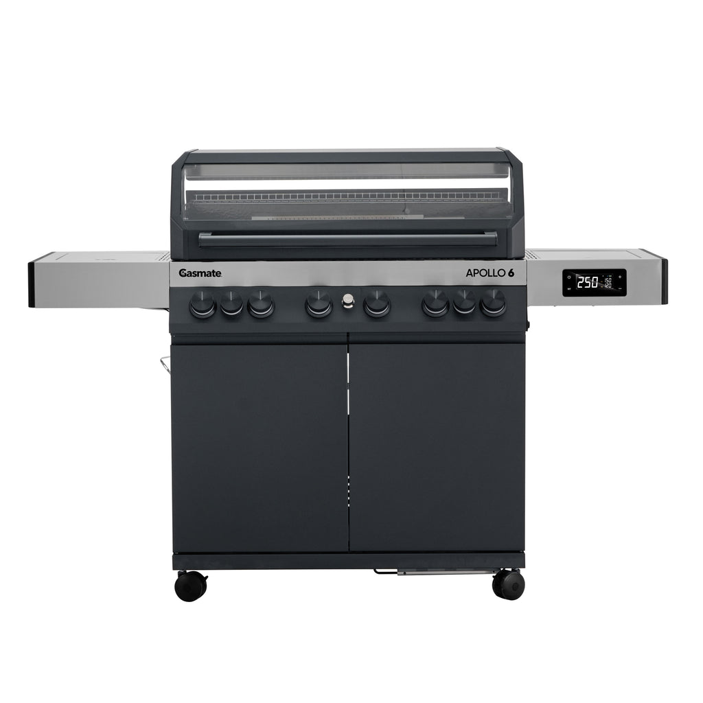 The Gasmate Apollo 6 Burner BBQ delivers powerful performance and modern style. Featuring a powder coated body, glass viewing window, stainless steel fascia and shelves, and cast iron cooking plates, it’s built for serious outdoor cooking.
