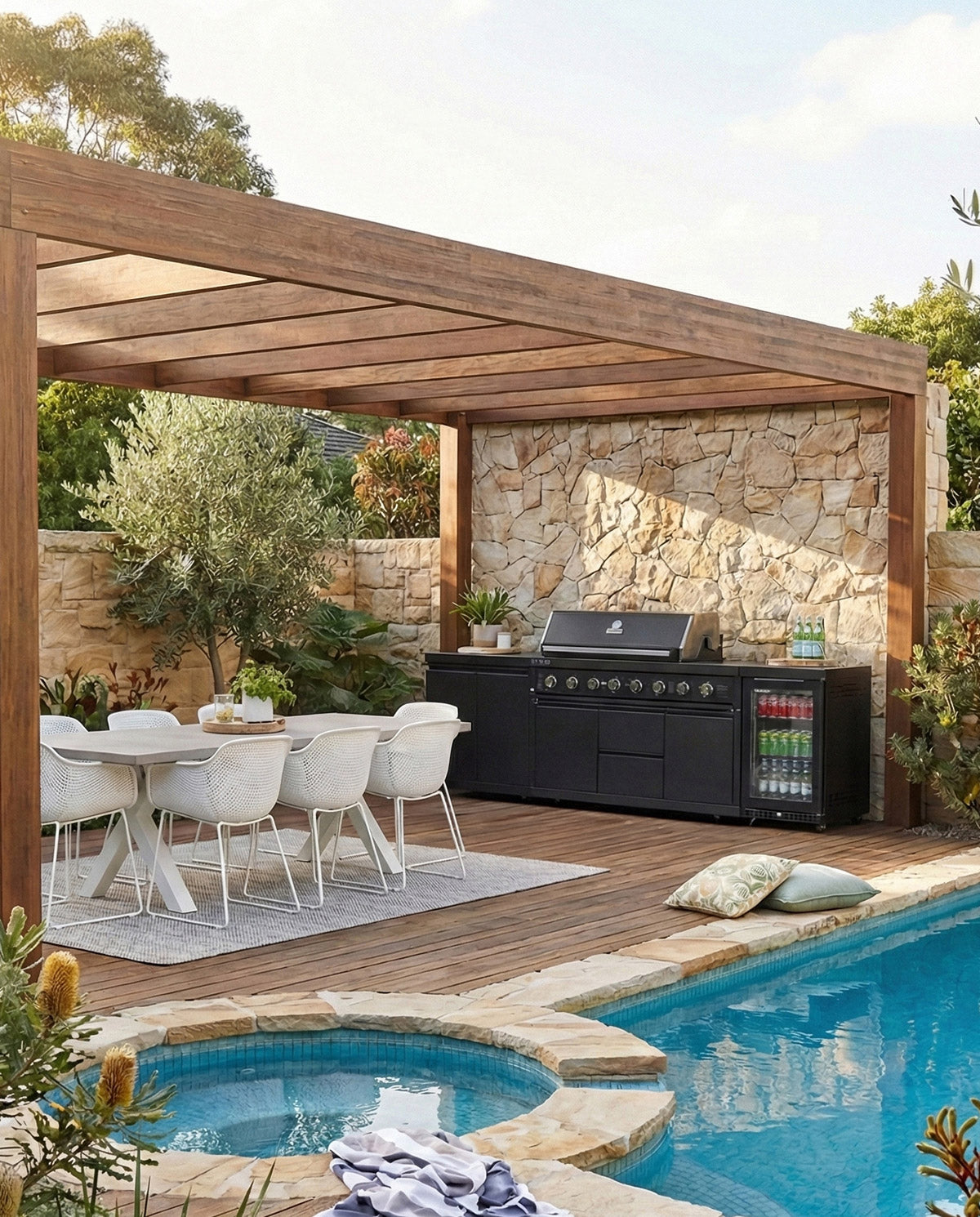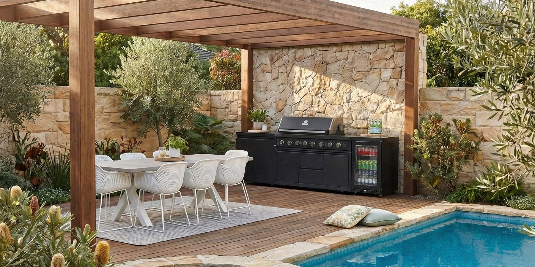 Consisting of two of the most popular modules in the Gasmate Nova Range, along with a 6-Burner BBQ with rear burner, this kitchen has all that you need, featuring a 1- door bar fridge, ample bench space and all the storage you could need, this stylish contemporary kitchen ticks all the boxes.