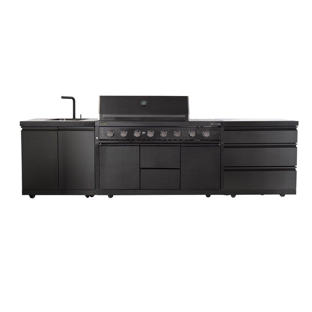 Introducing the refreshed Gasmate Nova MK2 range. We've added flame failure safety technology, which automatically cuts off the gas if the flame goes out, offering added peace of mind. Additional new features include upgraded sintered stone tops, new sink module with integrated chopping board and rotisserie kit & charcoal tray now included with all BBQ modules.