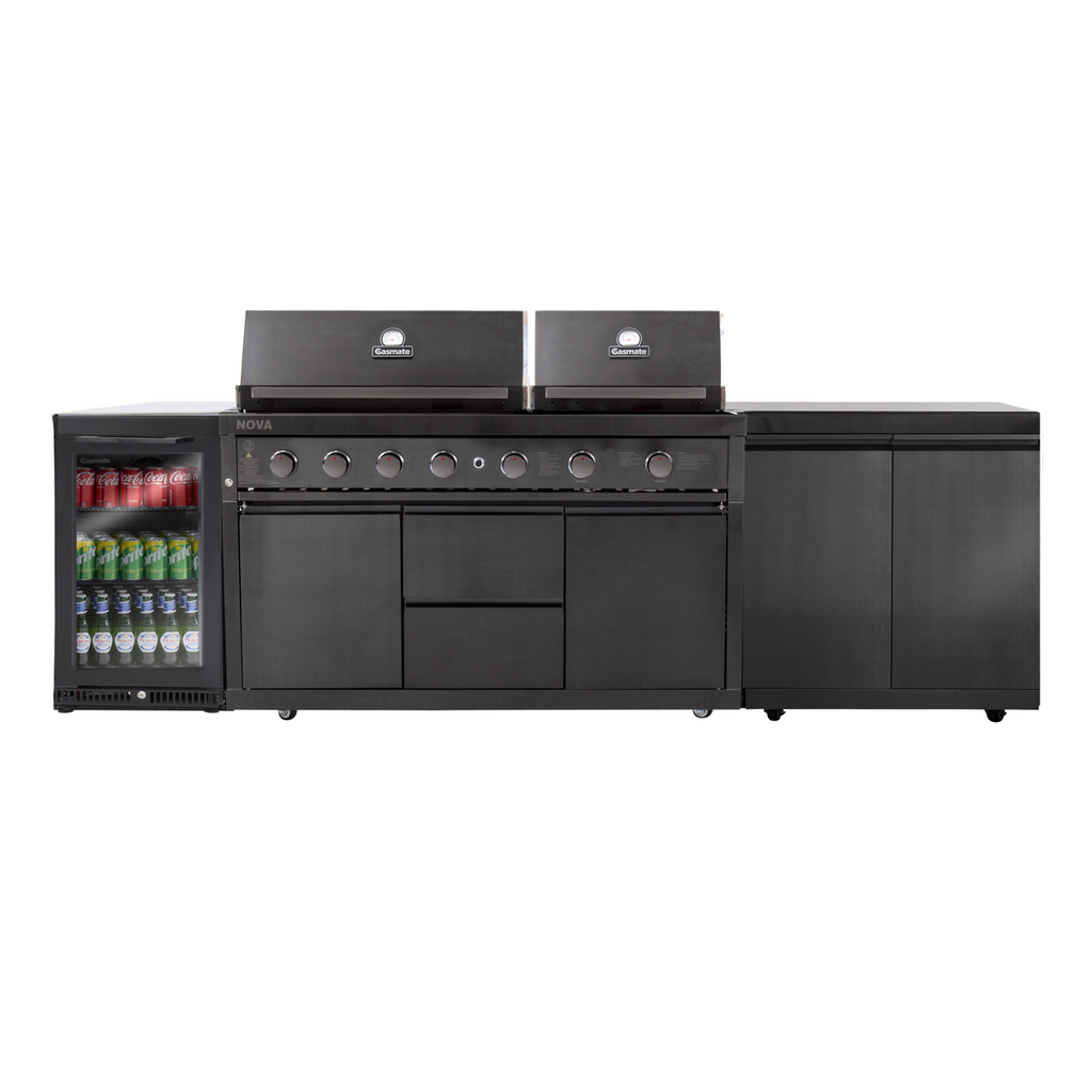 Consisting of two modules of the Gasmate Nova Range, along with a Twin Hood 6-Burner BBQ, this kitchen has all that you need. The stylish Twin-Hood design allows for cooking versatility. With a 1- door bar fridge and a cupboard with ample bench space and all the storage you could ever desire, this stylish contemporary kitchen ticks all the boxes.