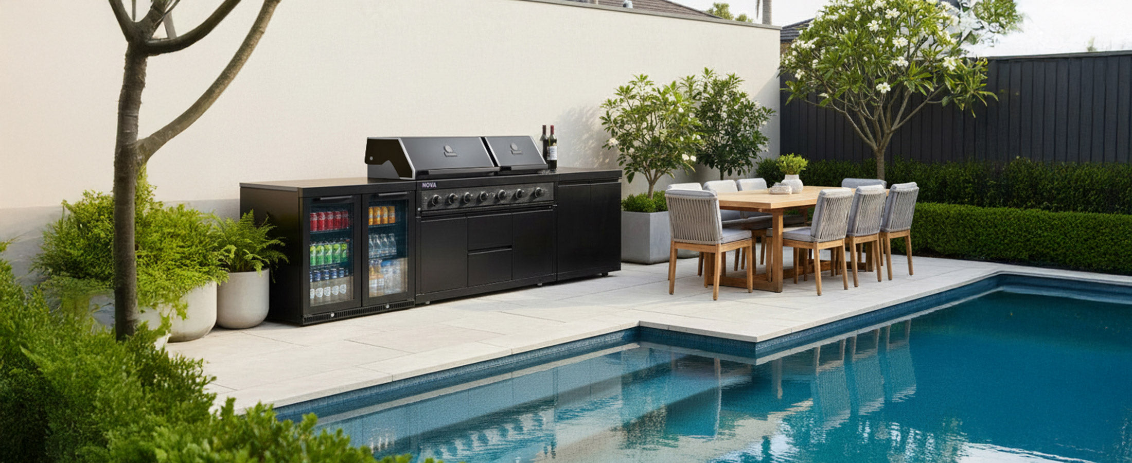 Consisting of two modules of the Gasmate Nova Range, along with a Twin Hood 6-Burner BBQ, this kitchen has all that you need. The stylish Twin-Hood design allows for cooking versatility. With a 2 - door bar fridge, cupboard with ample bench space and all the storage you could ever desire, this stylish contemporary kitchen ticks all the boxes.